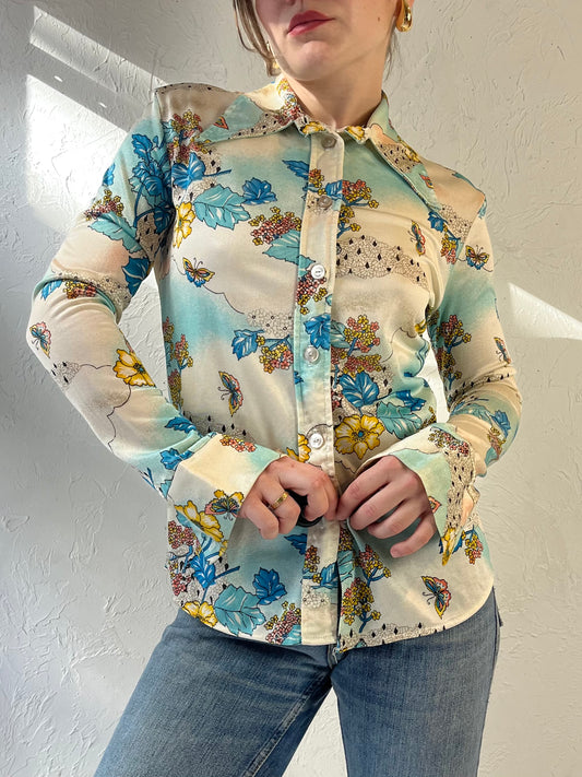 70s Union Made Blue Floral Button Up Blouse / Small