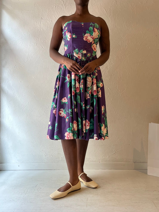 90s 'We Ltd' Purple Floral Print Strapless Dress / Small - Medium