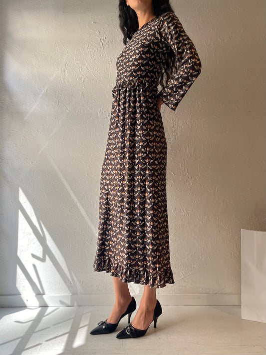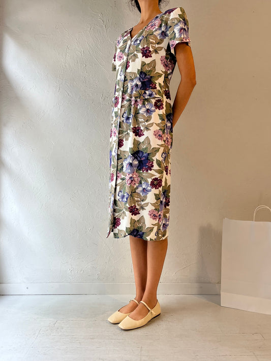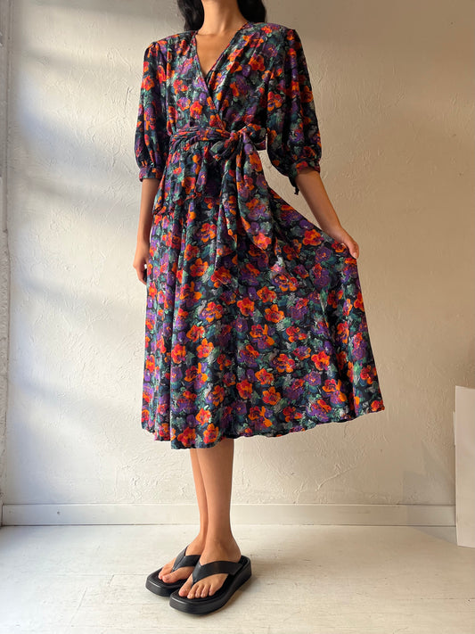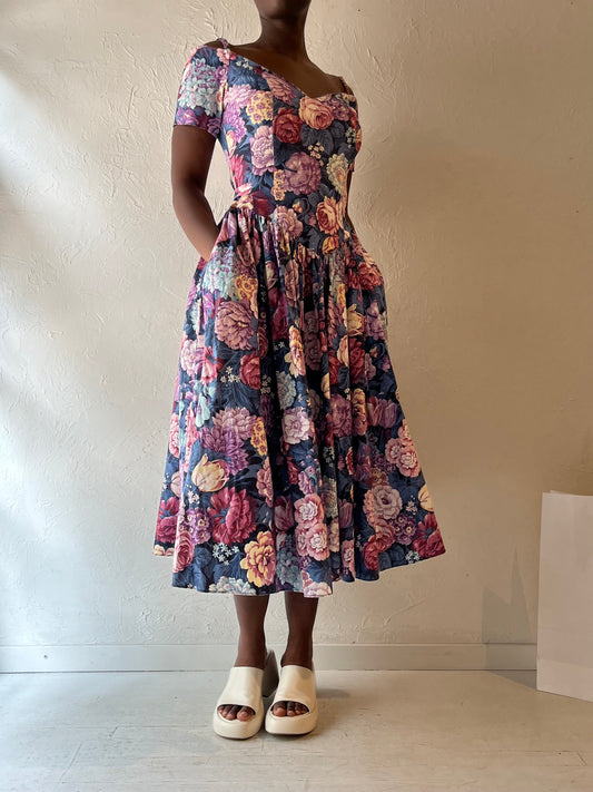 80s 'Dawn Joy' Floral Print Midi Dress / Medium - Large