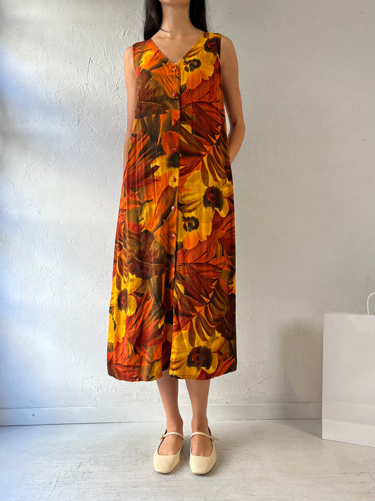 90s ‘Jams World’ Orange Floral Print Rayon Dress / Large