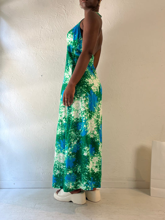 Vintage Handmade Green Patterned Halter Dress / Medium