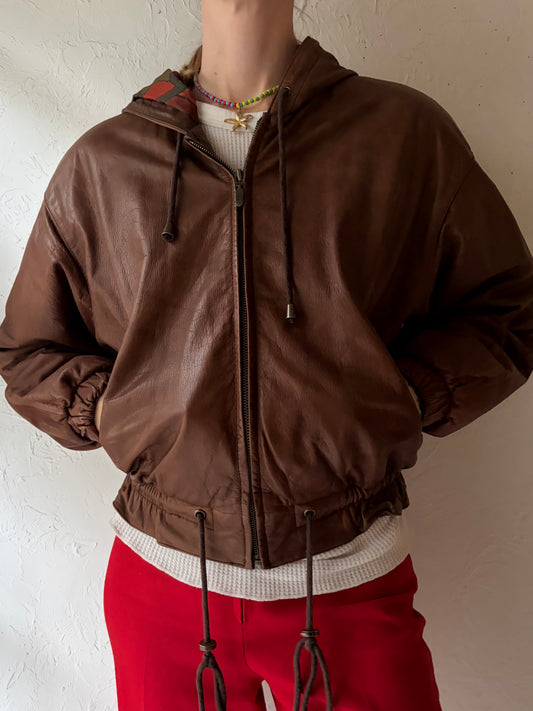 90s 'Adventure Bound' Brown Cropped Hooded Leather Jacket / Small