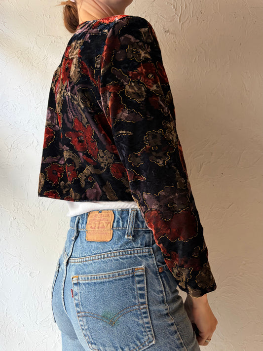 80s 'Beechers Brook' Floral Print Velvet Retro Cropped Evening Jacket / Small