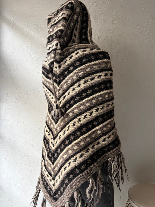 Vintage Hand Knit Wool Hooded Poncho / Small
