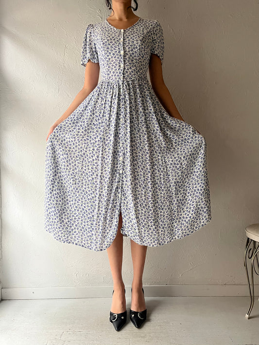 90s 'Pioko' Blue Floral Rayon Dress / Small
