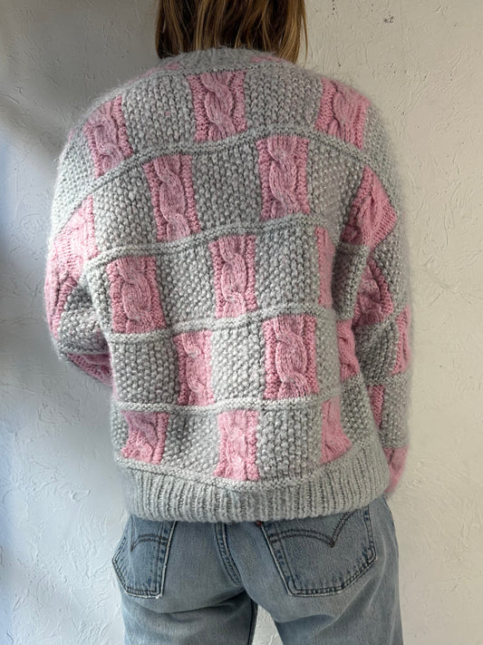 Vintage Pink and Grey Check Cable Knit Sweater / Medium
