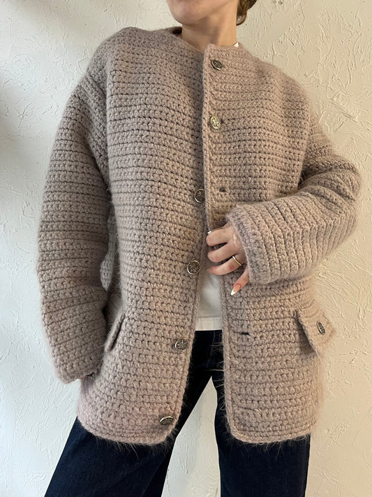 Vintage Hand Crochet Grey Cardigan Sweater / Medium