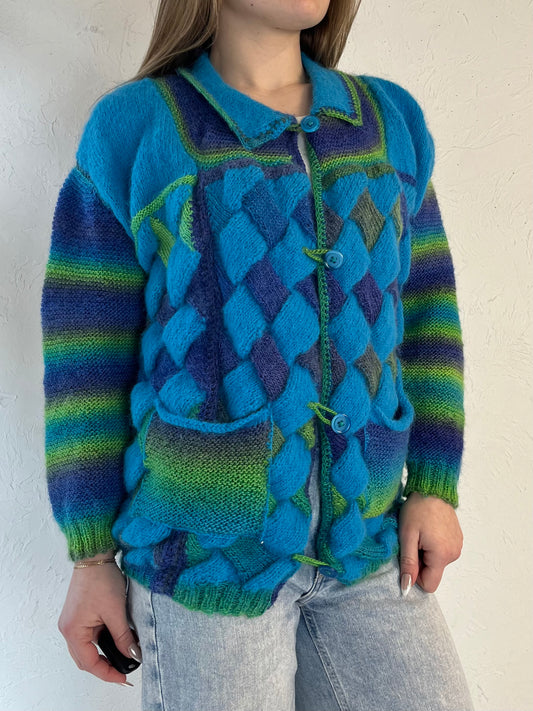 Vintage Hand Knit Blue Cardigan Sweater / Small