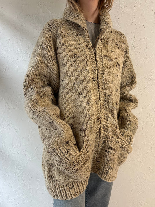 Vintage Hand Knit Beige Zip Up Sweater / Large
