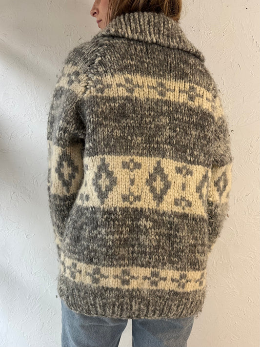 Vintage Hand Knit Gray Wool Zip Up Sweater / Medium