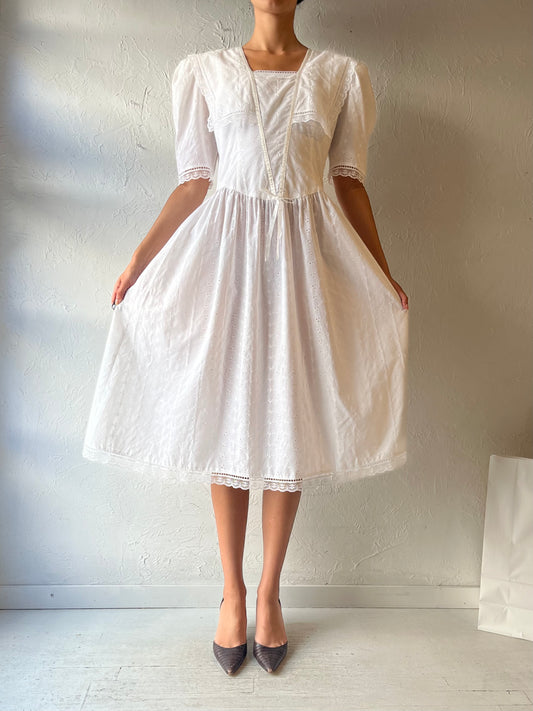 90s ‘Byer Too’ White Floral Puff Sleeve Dress / Medium