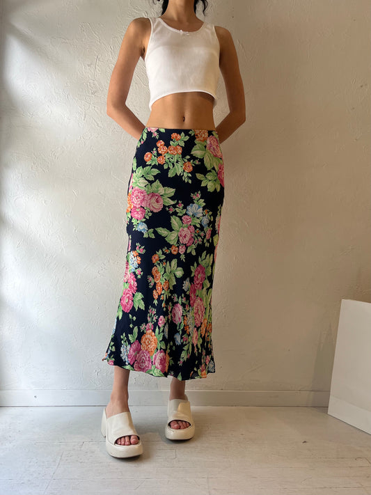 Y2K ‘Jones New York’ Navy Blue Floral Silk Maxi Skirt / Medium
