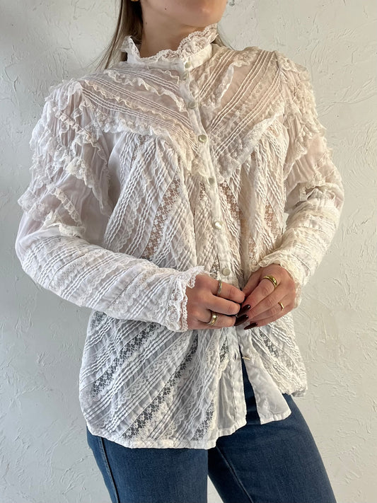 70s White Lace Button Up Blouse / Cover Up / Medium