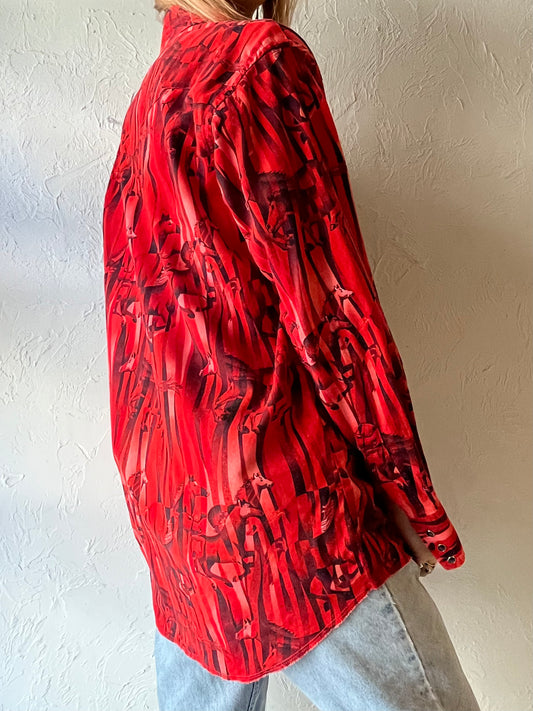 90s ‘Wrangler’ Abstract Horse Print Red Pearl Snap Shirt / Medium