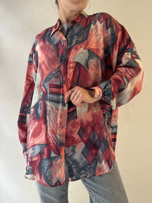 90s ‘Emblem’ Silk Button Up Blouse / Medium