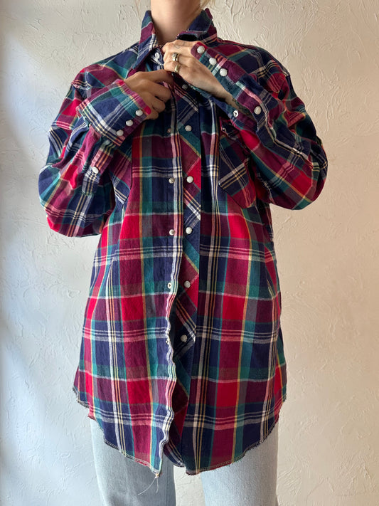 90s 'Wrangler' Plaid Pearl Snap Shirt / Large