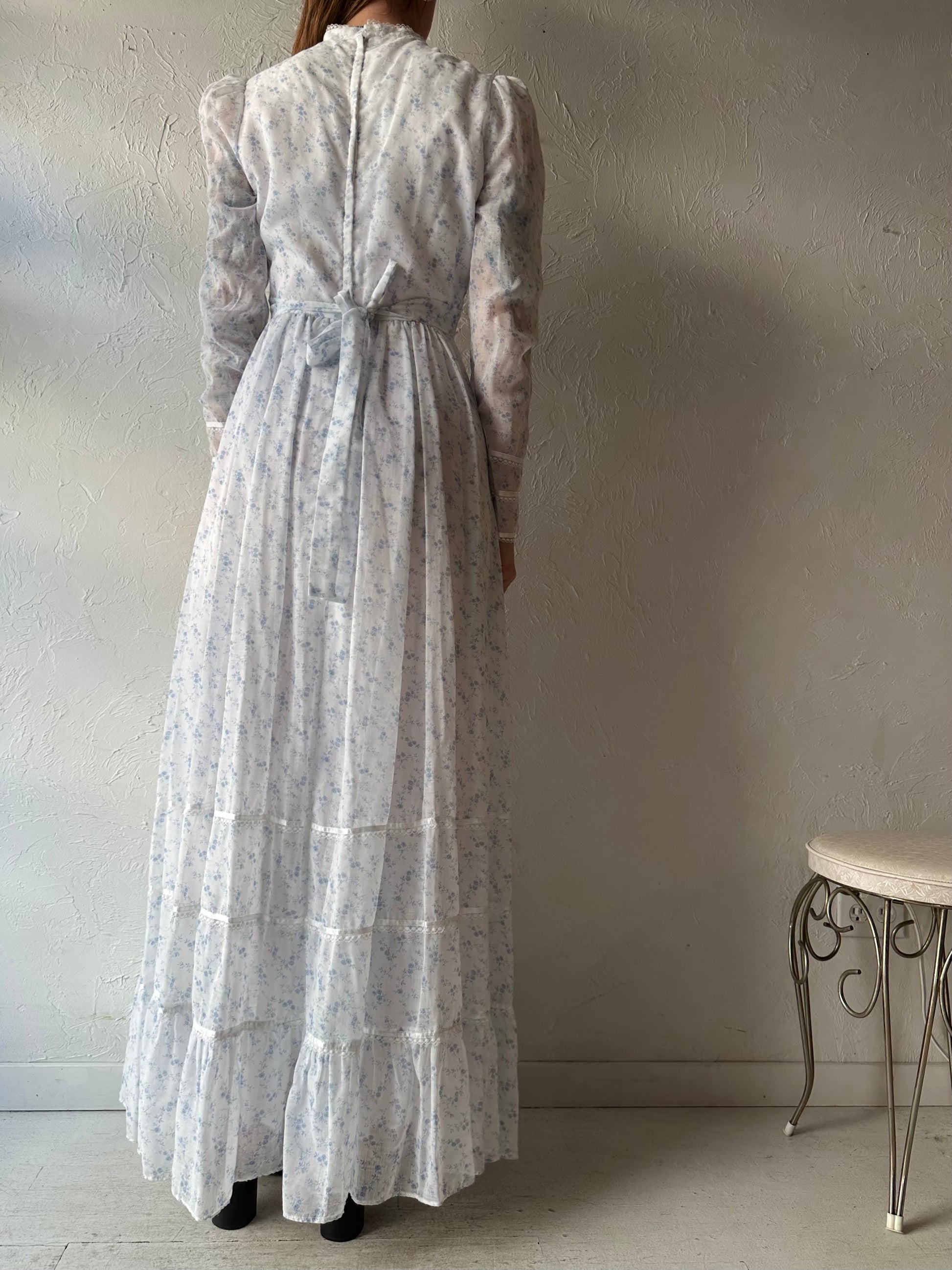 70s 'Candy Jones' Blue Floral Long Sleeve Peasant Dress / Small