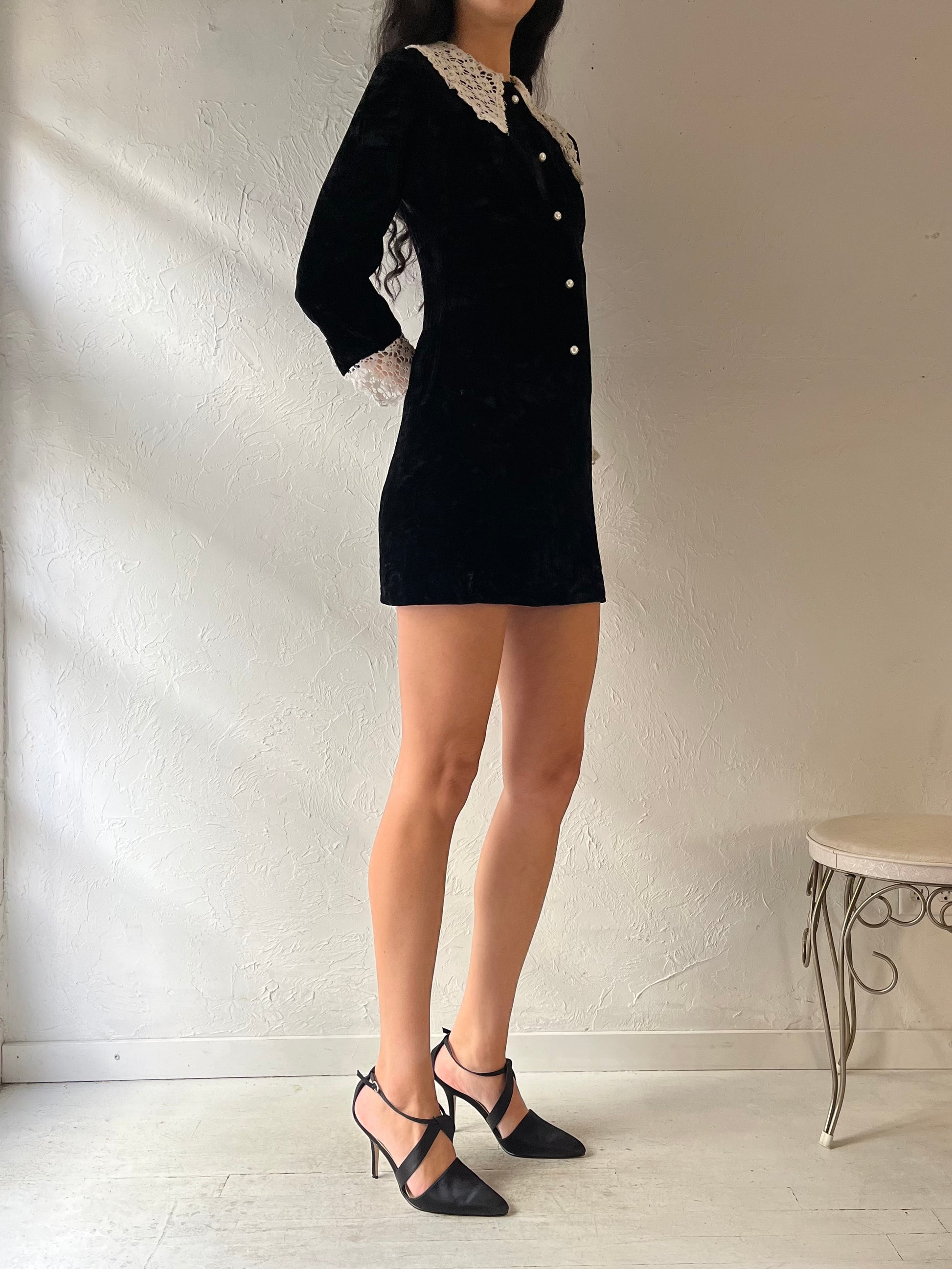 70s 'Perri' Black Long Sleeve Velvet Mini Dress / Small