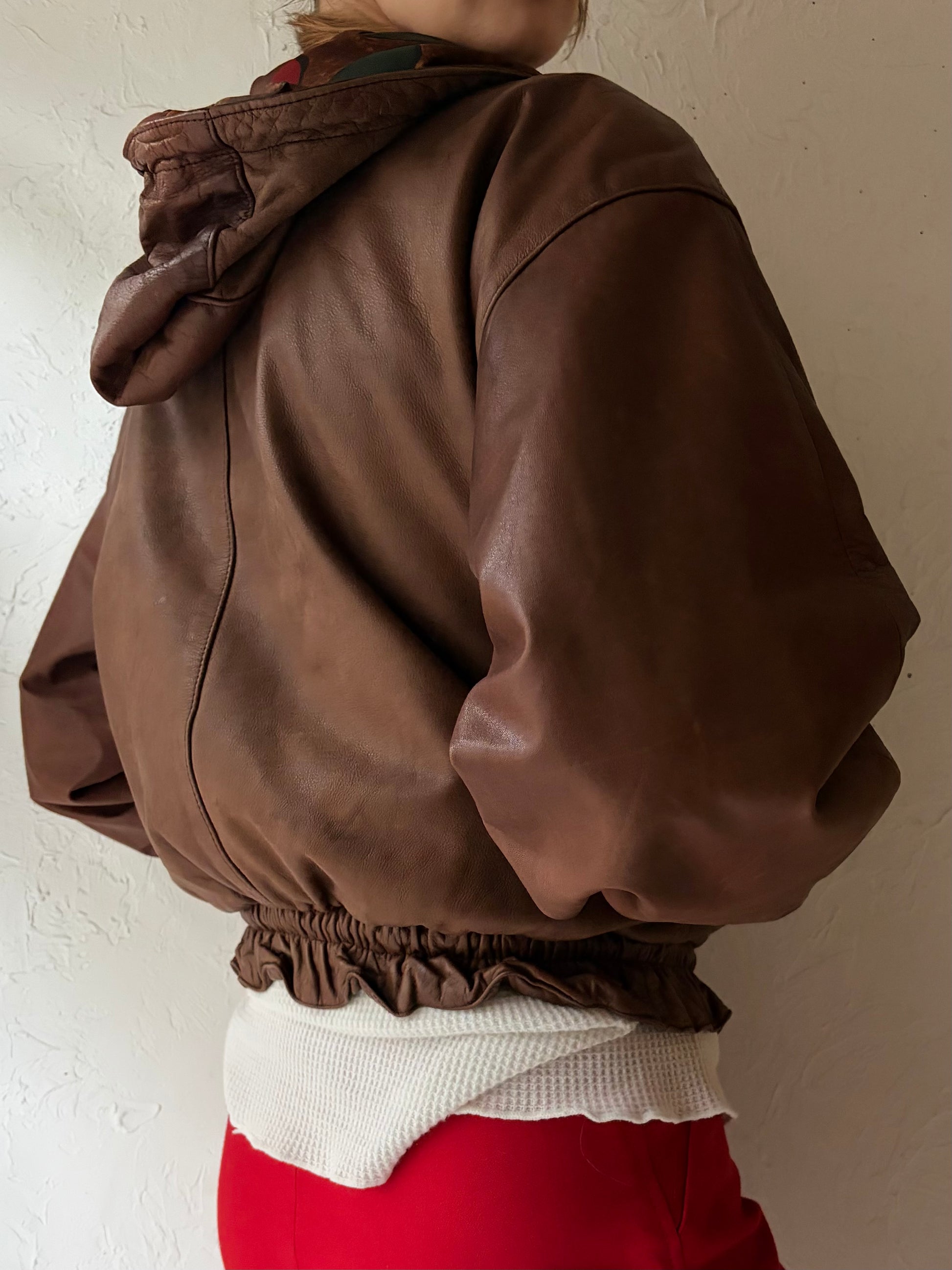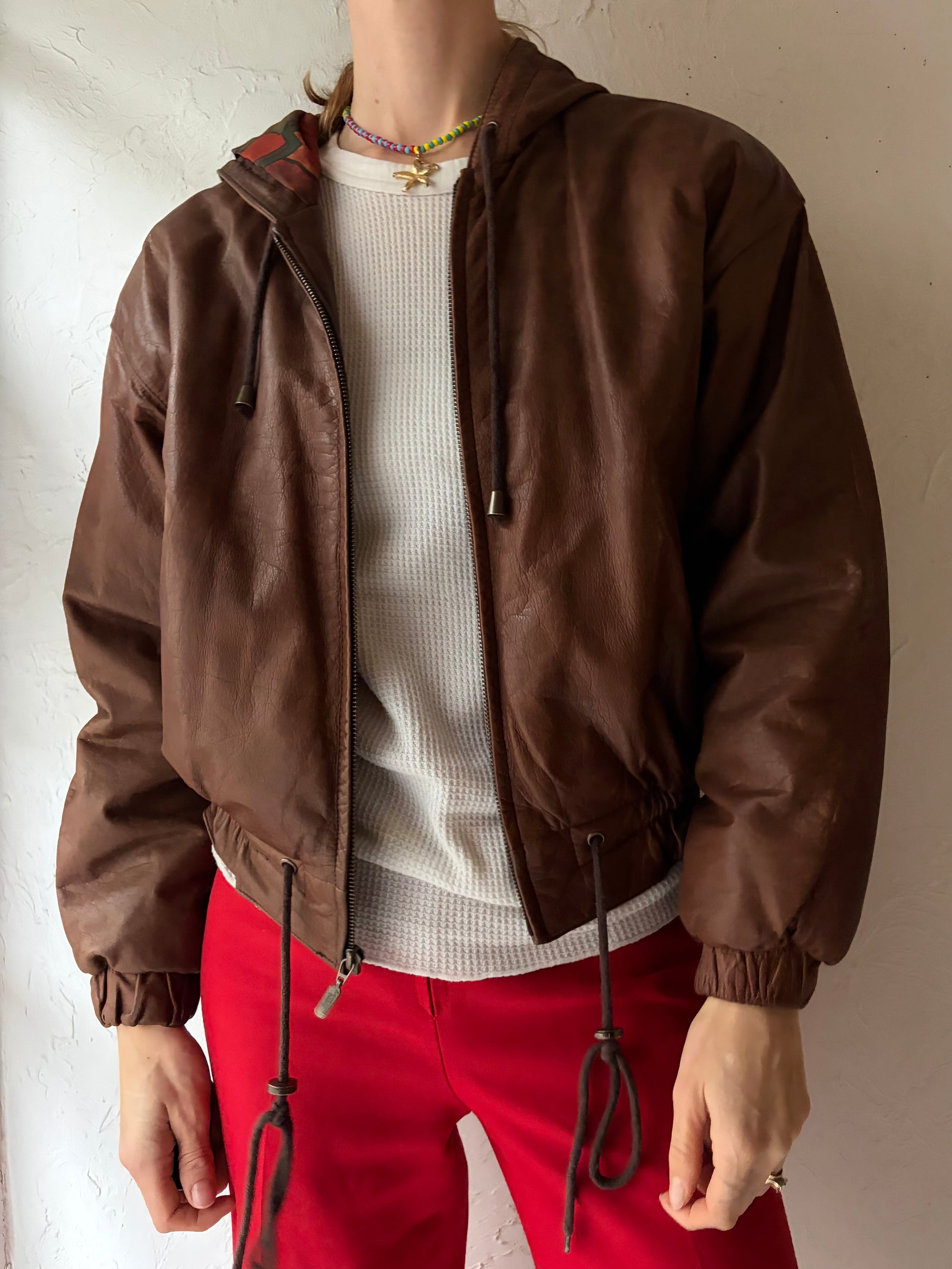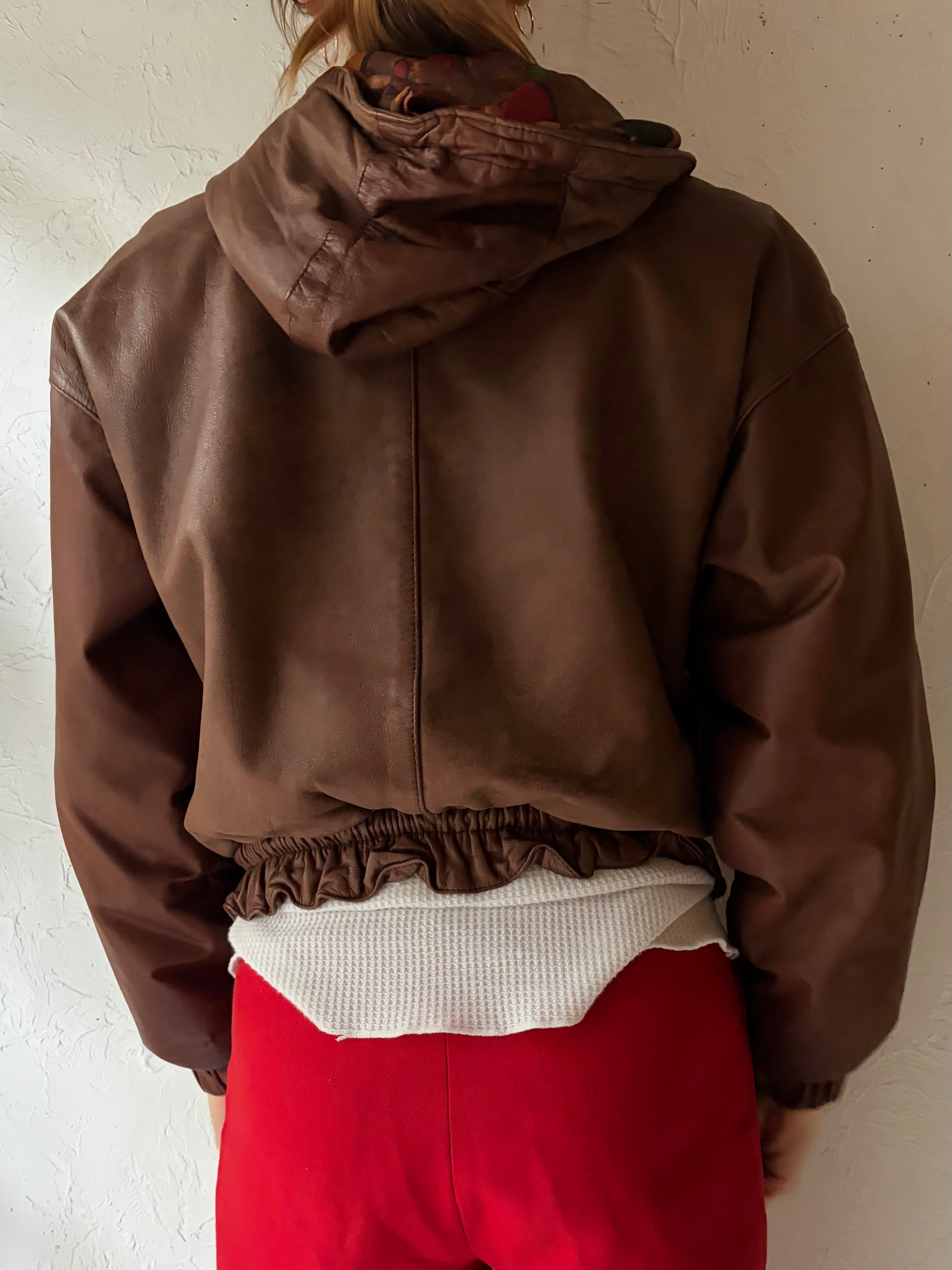 90s 'Adventure Bound' Brown Cropped Hooded Leather Jacket / Small