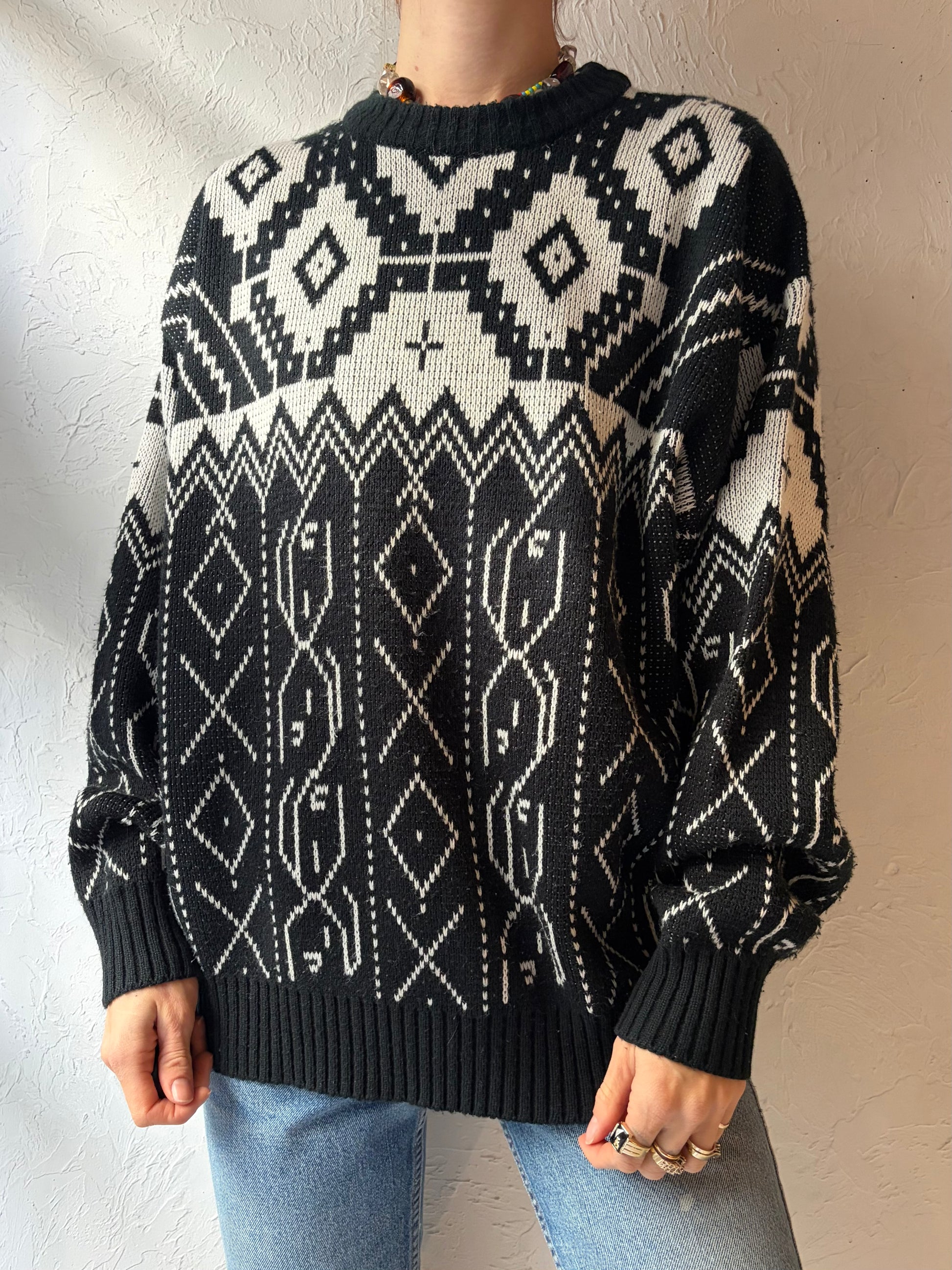 90s ‘Bay Club’ Black Acrylic Patterned Crew Neck Sweater / XL