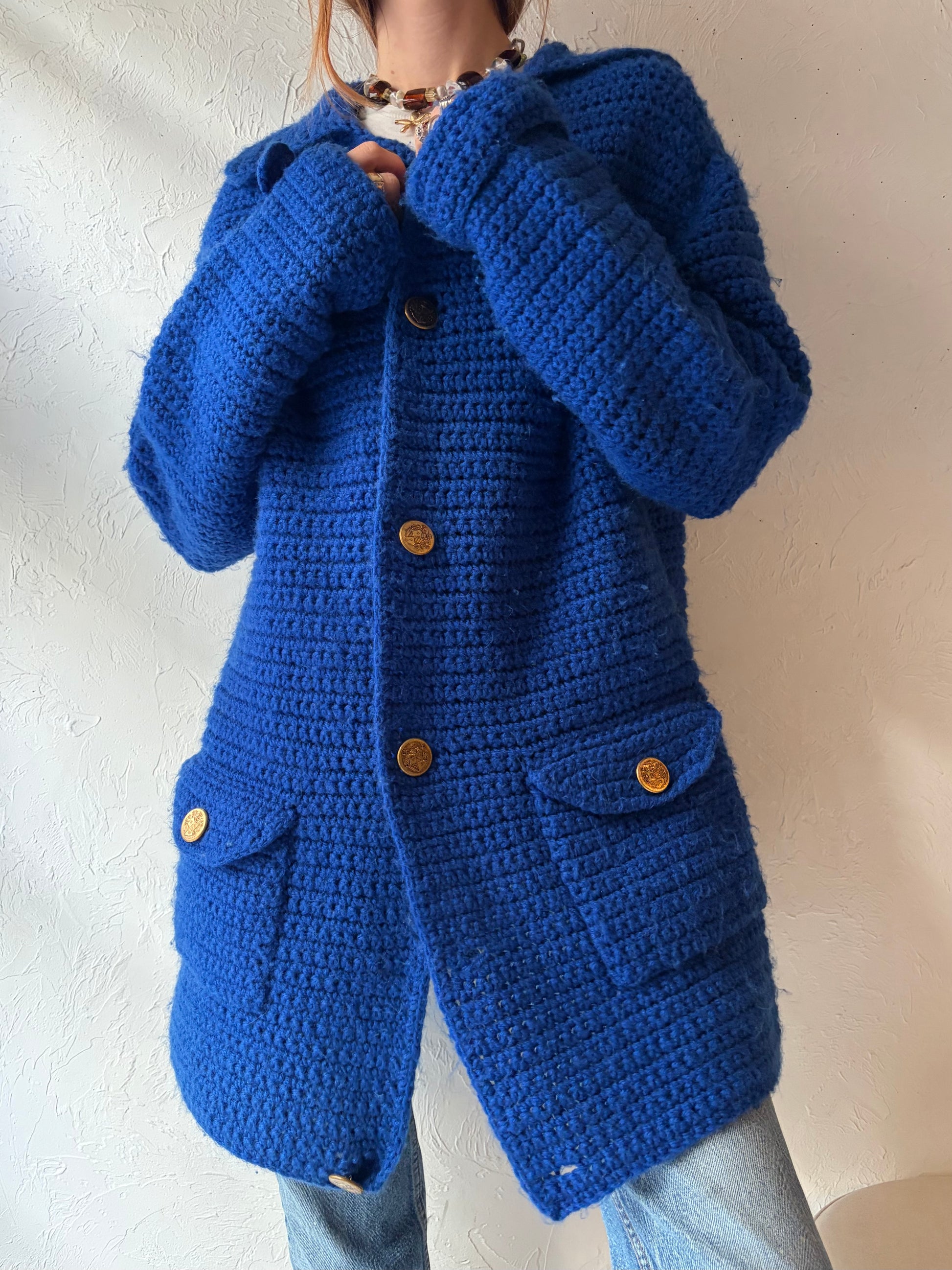 Vintage Royal Blue Crochet Cardigan Sweater / Large