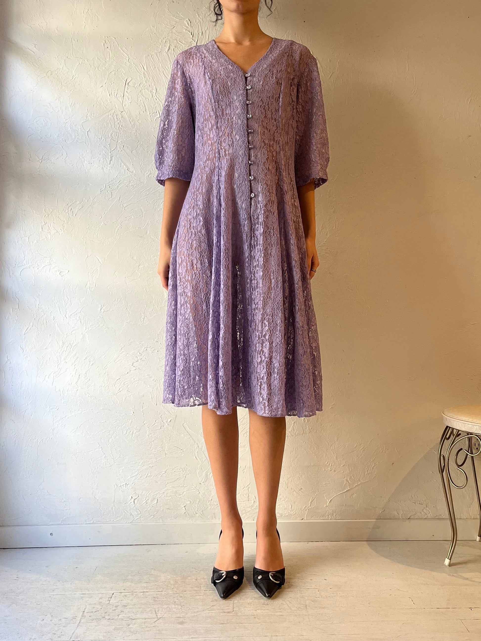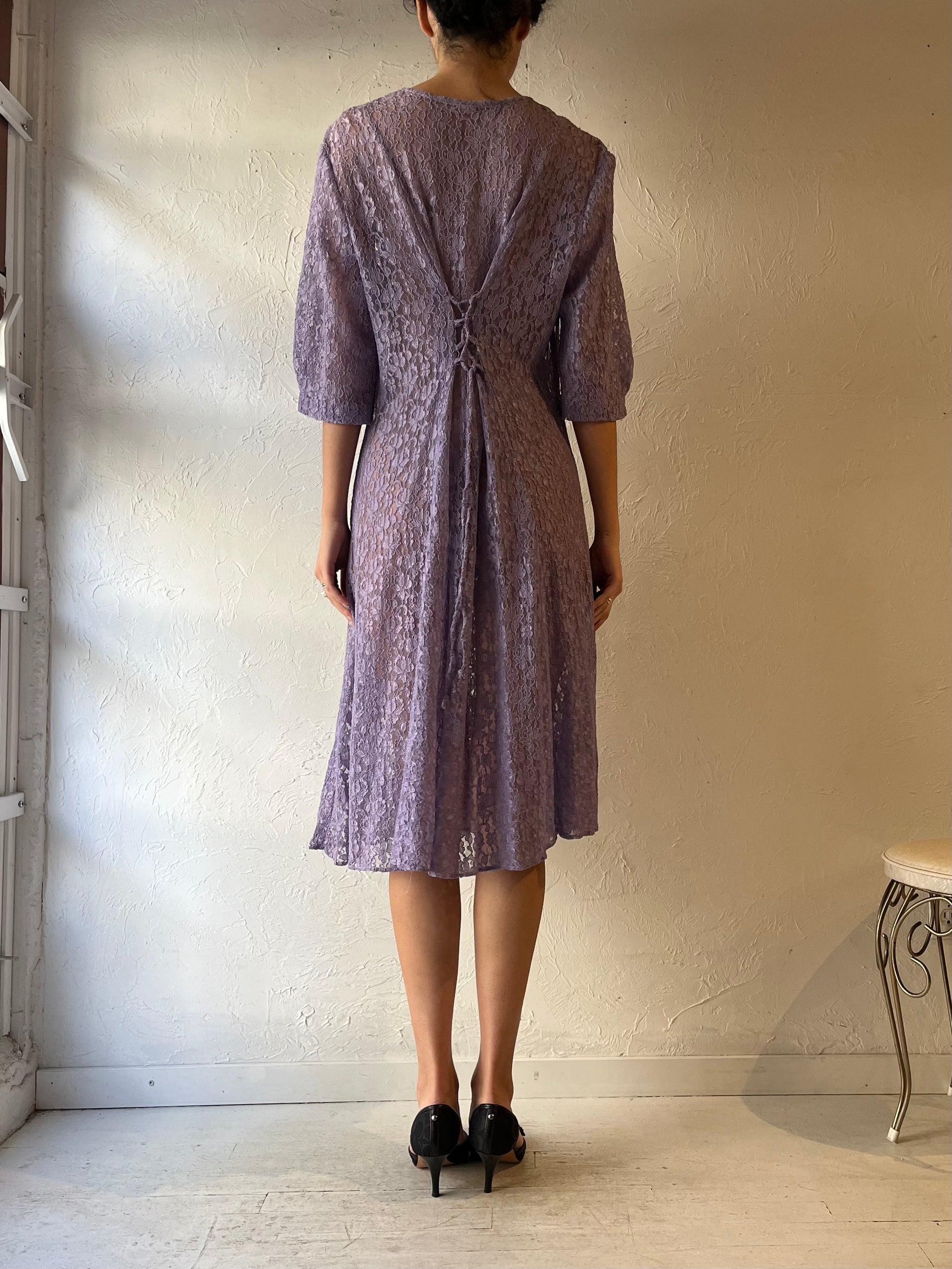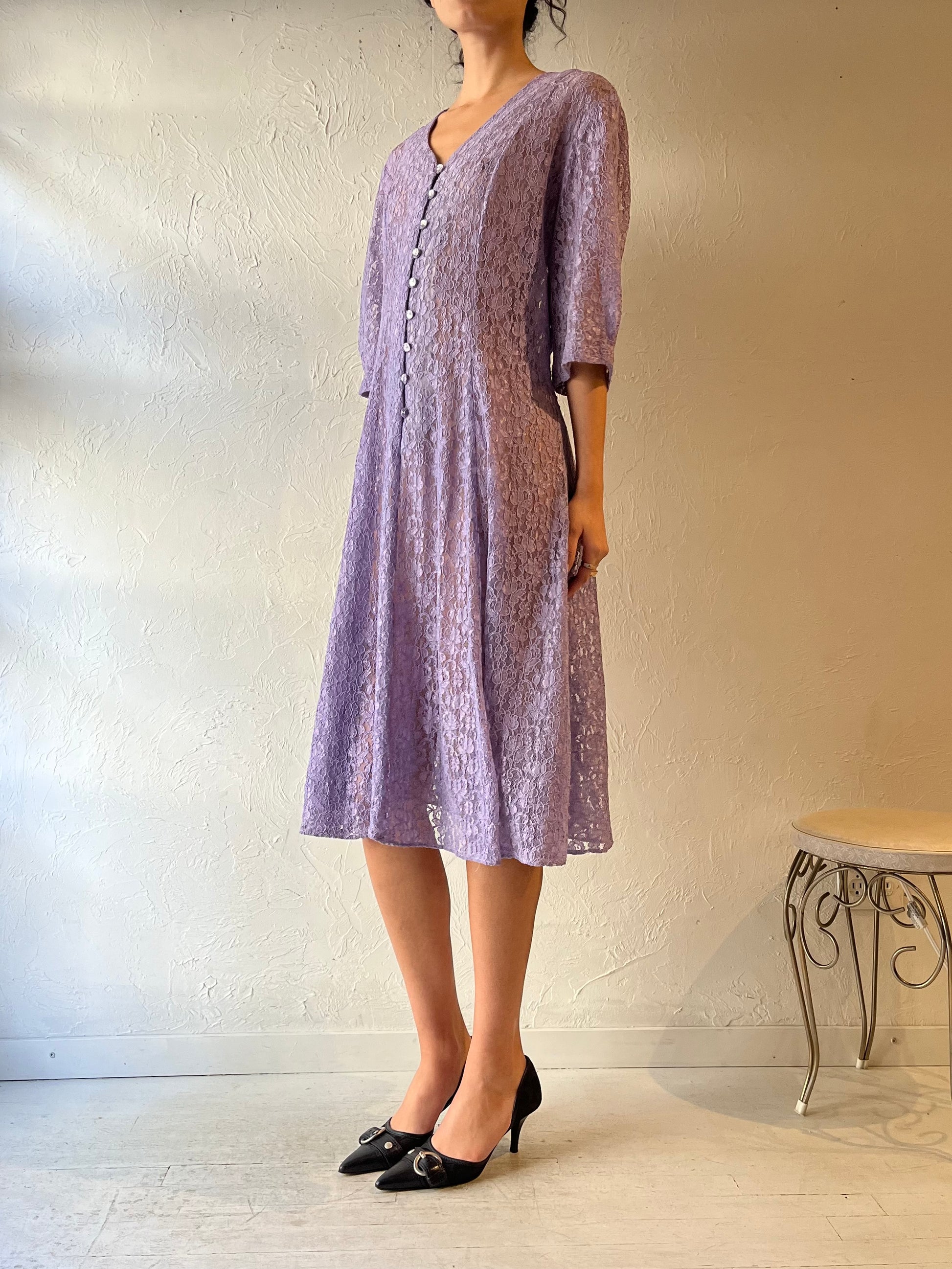 90s Purple Sheer Lace Midi Dress / Medium