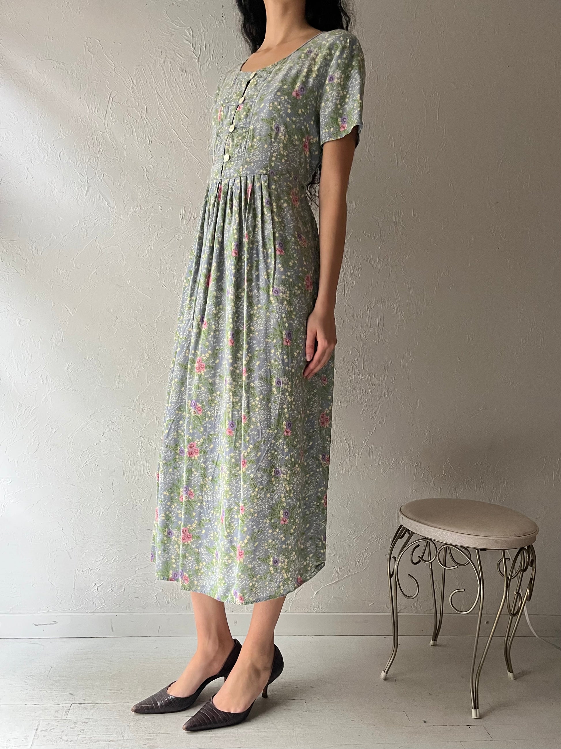 90s 'Chablis' Green Floral Dress / Small