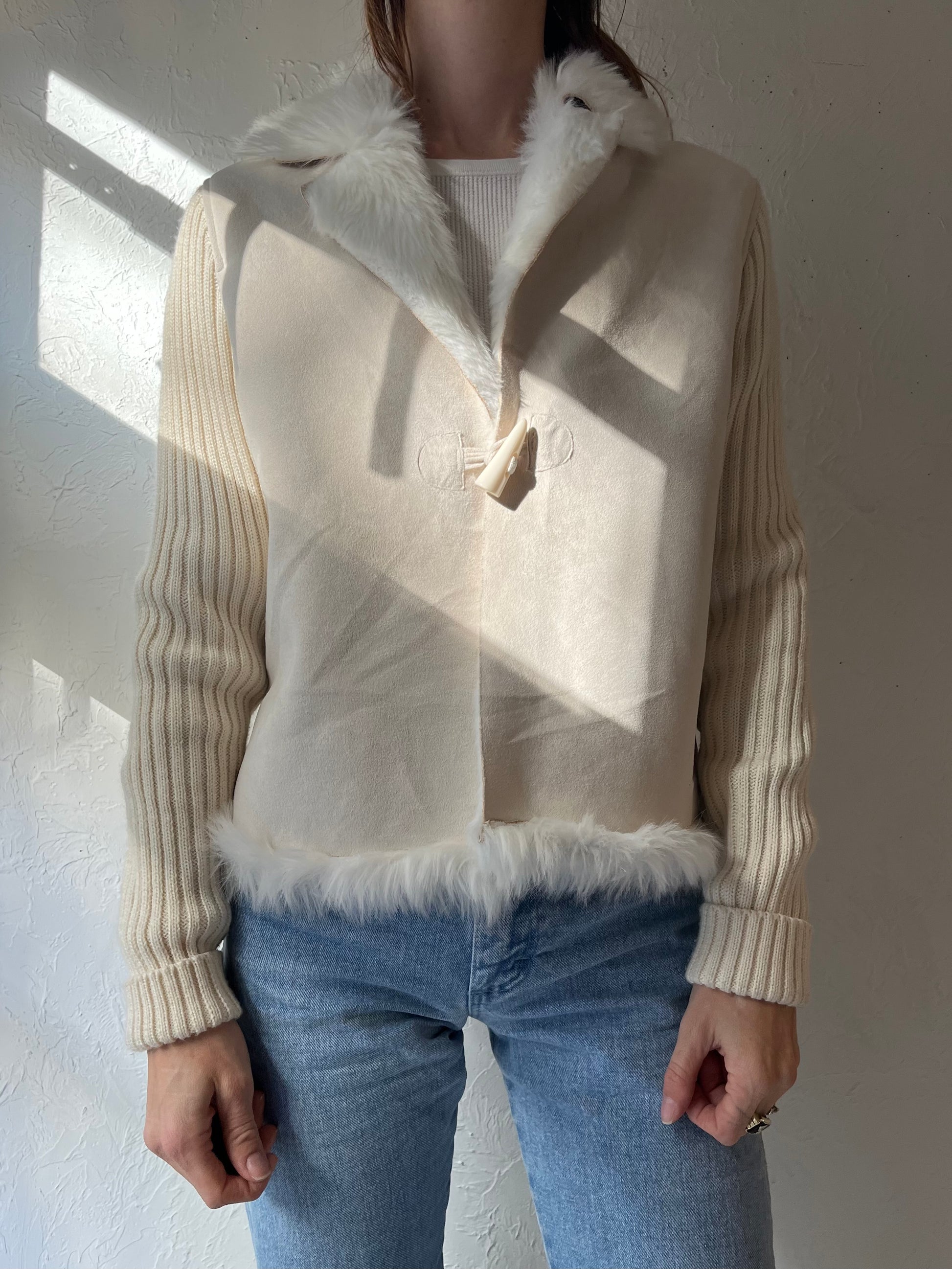 - Montanaco white faux suede jacket with knit sleeves and faux fur lining